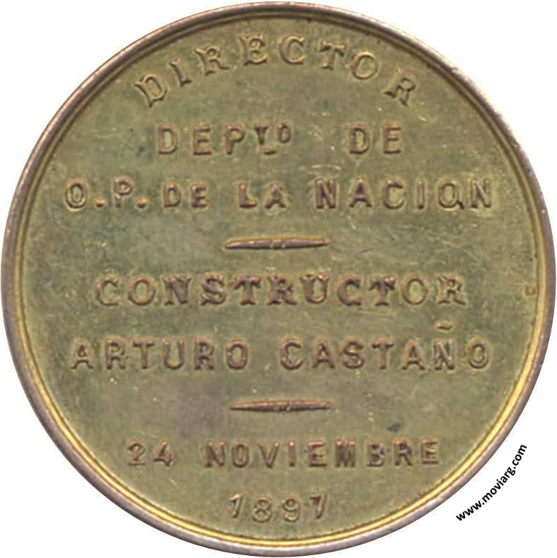 Anverso: F.C. DEP. Á RIOJA Y CHILECITO / SECCIONES / Á / TALAMUYUNA Y COLORADOS. Firma: GOTTUZZO Y COSTA Reverso: DIRECTOR / DEPTO. DE / O.P. DE LA NACION / CONSTRUCTOR / ARTURO CASTAÑO / 24 NOVIEMBRE / 1897 Referencia: | |