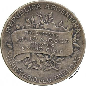 | Año: 1904 Ferrocarriles Metal: Plateado - Peso: 28gr - Módulo: 40mm Grabador: Juan Gottuzzo | |