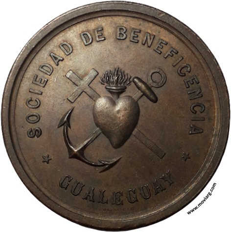 Anverso: SOCIEDAD DE BENEFICENCIA / GUALEGUAY. Firma: ORZALI B. Y C. Reverso: COLOCACION DE LA PIEDRA FUNDAMENTAL / HOSPITAL / SAN ANTONIO / 12 DE OCTUBRE / 1898 Referencia: | |