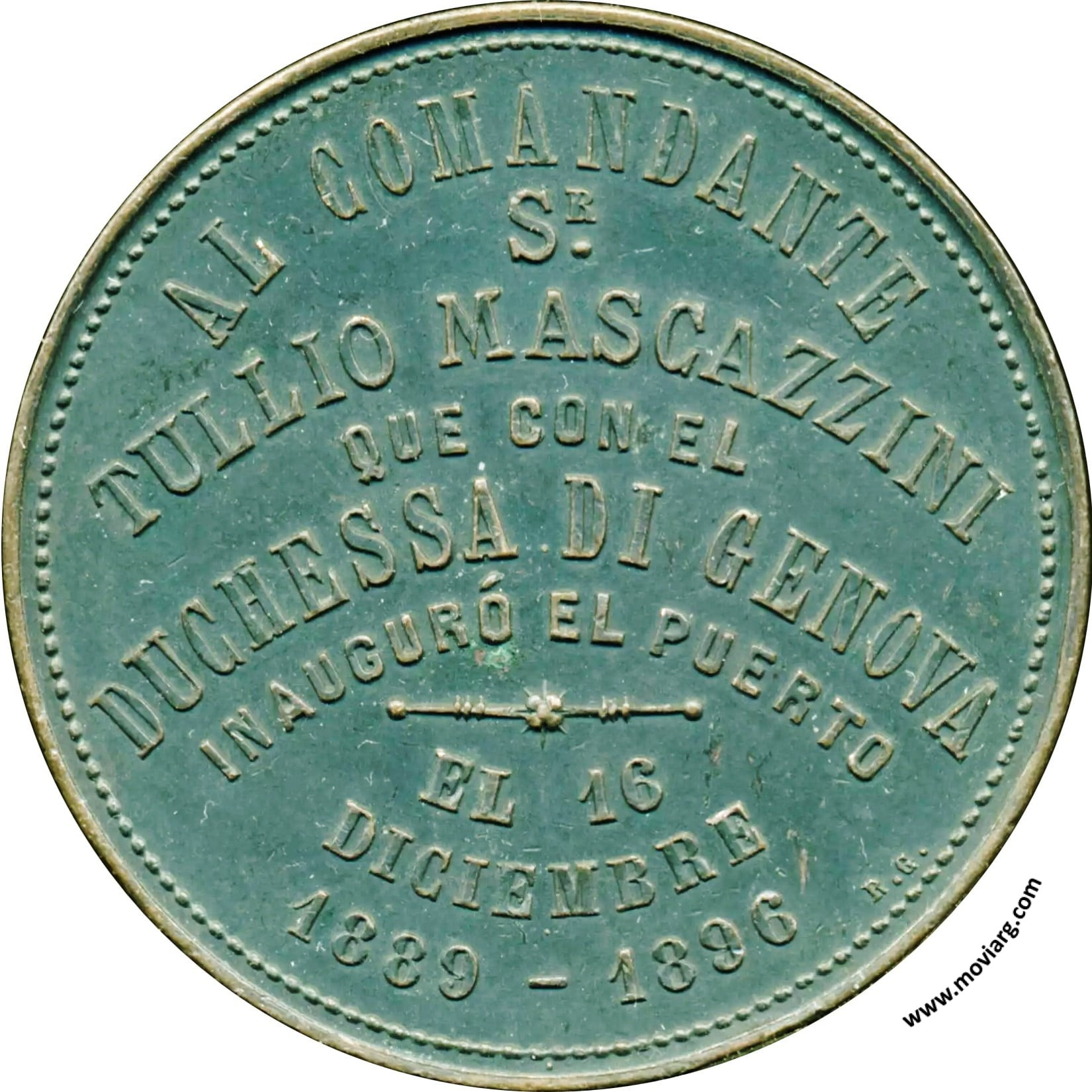 Anverso: EL VECINDARIO DEL PUERTO DE LA PLATA / REPÚBLICA ARGENTINA Reverso: AL COMANDANTE / SR. / TULLIO MASCAZZINI / QUE CON EL / DUCHESSA DI GENOVA / INAUGURÓ EL PUERTO / EL 16 / DICIEMBRE / 1889 - 1896 Referencia: | |
