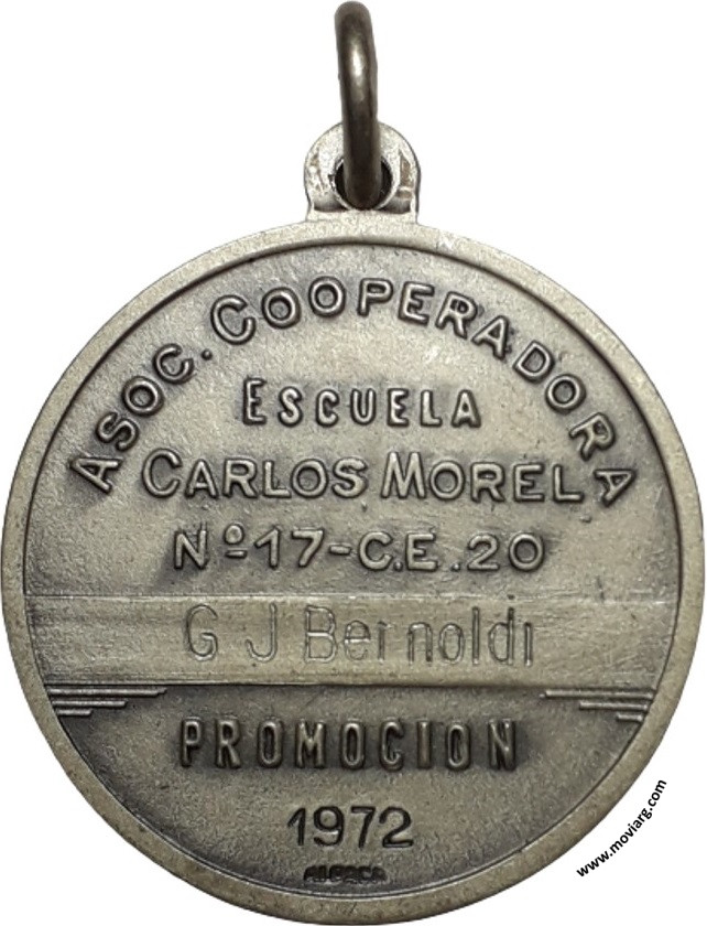 Colección MDS Anverso:Reverso: ASOC. COOPERADORA / ESCUELA / CARLOS MOREL / N° 17 - C. E. 20 / [ C J BERNOLDI ] / PROMOCION / [ 1972 ]. Exergo: [ ALPACA ] Referencia: | |