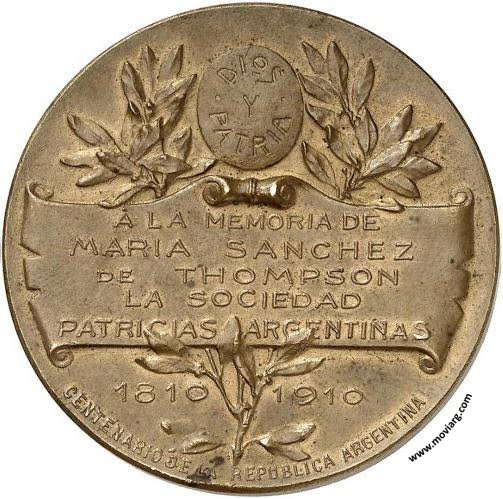 Anverso: 1786 / 1868 Reverso: DIOS / Y / PATRIA / Á LA MEMORIA DE / MARIA SANCHEZ / DE THOMPSON / LA SOCIEDAD / PATRICIAS ARGENTINAS / 1810 1910 / CENTENARIO DE LA REPÚBLICA ARGENTINA Referencia: BURZIO-2143 | |