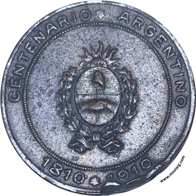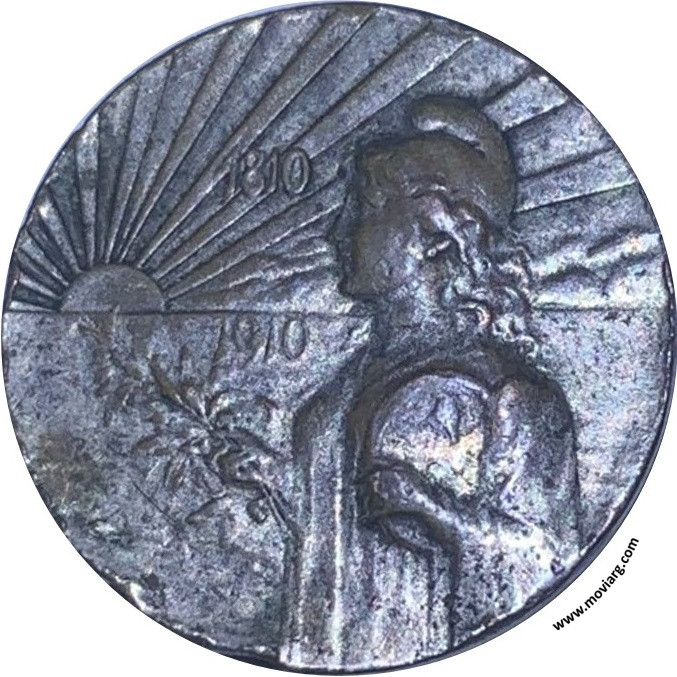 Colección Magnin Anverso: 1810 / 1910. Descripción: Busto de la República de perfil izquierdo con escudo en brazo izquierdo y rama de laurel en brazo derecho, sol naciente en horizonte leyenda en dos líneas / 1810 / 1910 /.Reverso: CENTENARIO ARGENTINO / 1810 - 1910. Descripción: En el centro el Escudo de la República Argentina, con leyenda perimetral separada del escudo por un círculo de granetes, en parte superior el texto / CENTENARIO (estrella de seis puntas) ARGENTINO / y debajo / 1810 (estrella de seis puntas) 1910 / Referencia: | |
