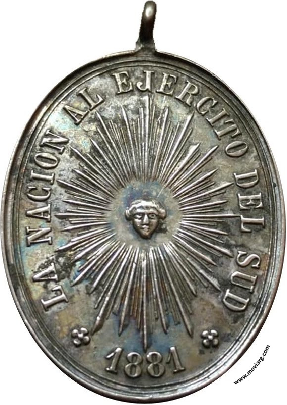 Anverso: CAMPAÑA DEL RIO NEGRO Y PATAGONIA / 1878 Reverso: LA NACION AL EJERCITO DEL SUD / 1881 Referencia: | |