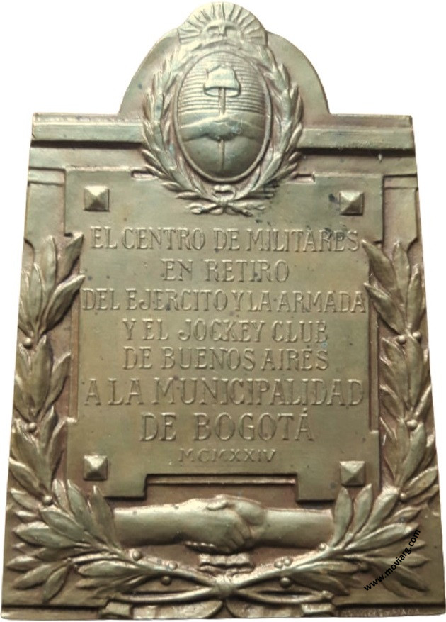 Anverso: Reverso: EL CENTRO DE MILITARES / EN RETIRO / DEL EJERCITO Y LA ARMADA / Y EL JOCKEY CLUB / DE BUENOS AIRES / A LA MUNICIPALIDAD / DE BOGOTÁ / MCMXXIV. Firma: GOTTUZZO Y PIANA Referencia: | |