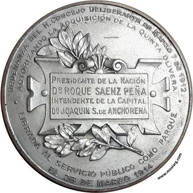 Anverso: Firma: C. Y AF. ROSSI Reverso: ORDENANZA DEL H. CONGRESO DELIBERANTE DE MARZO 7 DE 1912 / AUTORIZANDO LA ADQUISIÓN DE LA QUINTA OLIVERA / LIBRADA AL SERVICIO PÚBLICO COMO PARQUE / EL 28 DE MARZO 1914 / PRESIDENTE DE LA NACIÓN / DR. ROQUE SAENZ PEÑA / INTENDENTE DE LA CAPITAL / DR. JOAQUIN S. DE ANCHORENA Referencia: | |