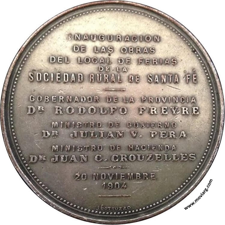 Anverso: PROVINCIA DE SANTA FÉ Reverso: INAUGURACION / DE LAS OBRAS / DEL LOCAL DE FERIAS / DE LA / SOCIEDAD RURAL DE SANTA FÉ / GOBERNADOR DE LA PROVINCIA / DR. RODOLFO FREYRE / MINISTRO DE GOBIERNO / DR. JULIAN V. PERA / MINISTRO DE HACIENDA / DR. JUAN C. CROUZELLES / 20 NOVIEMBRE / 1904. Firma: J. GOTTUZZO Referencia: | |