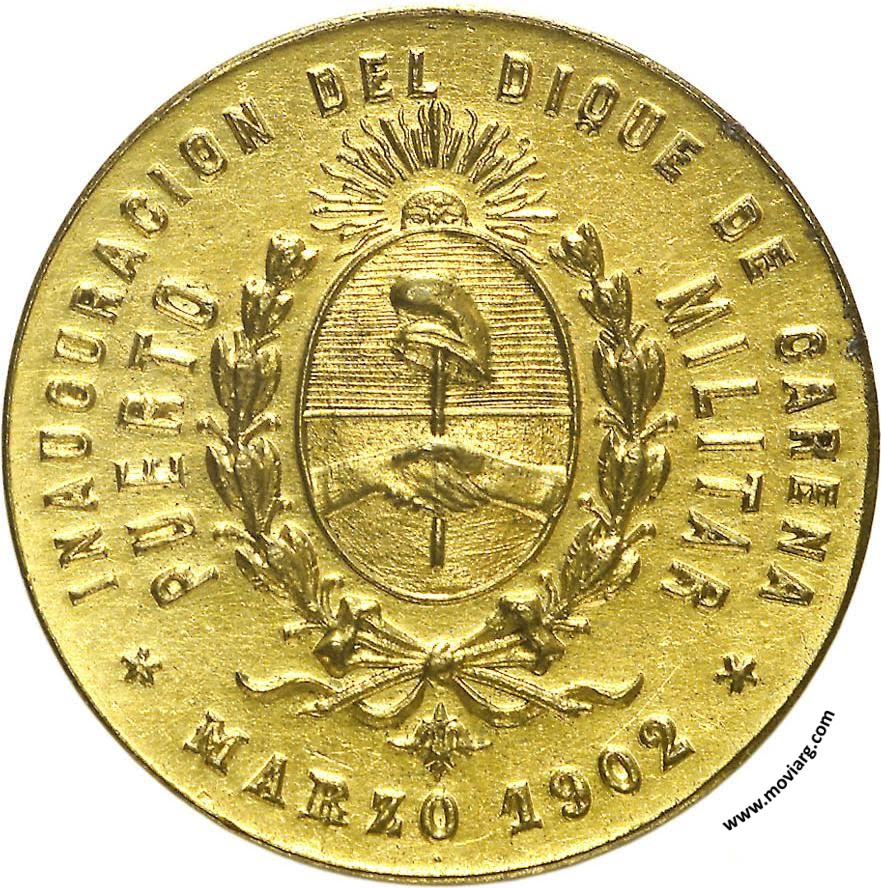 Anverso: INAUGURACION DEL DIQUE DE CARENA / MARZO 1902 / PUERTO / MILITAR Reverso: LA MAR NO DIVIDE, UNE / 1898 - 1902 Referencia: | |