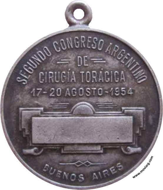 Anverso: SOCIEDAD ARGENTINA DE CIRUGÍA TORÁCICA / BUENOS AIRES. Firma: (???) Reverso: SEGUNDO CONGRESO ARGENTINO / DE / CIRUGÍA TORÁCICA / 17 - 20 AGOSTO - 1954 / BUENOS AIRES Referencia: | |