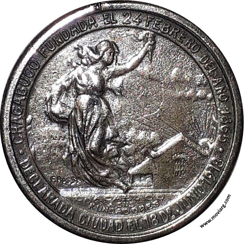 Anverso: CHACABUCO FUNDADA EL 24 FEBRERO DEL AÑO 1865 / DECLARADA CIUDAD EL 18 DE JUNIO 1918 / CHACABUCO / A SUS / FUNDADORES. Firma: ROSSI Reverso: 1816 - 9 DE JULIO - 1918. Firma: GOTTUZZO Y PIANA Referencia: | |