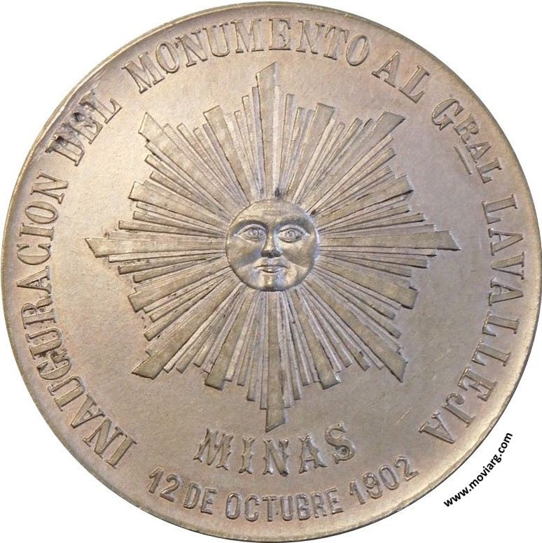 Anverso: INAUGURACION DEL MONUMENTO AL GRAL. LAVALLEJA / MINAS / 12 DE OCTUBRE 1902 Reverso: CARABINA Á LA ESPALDA Y SABLE EN MANO / 12 DE OCTUBRE DE 1825. Firma: BELLAGAMBA Y ROSSI / B. AIRES Referencia: | |