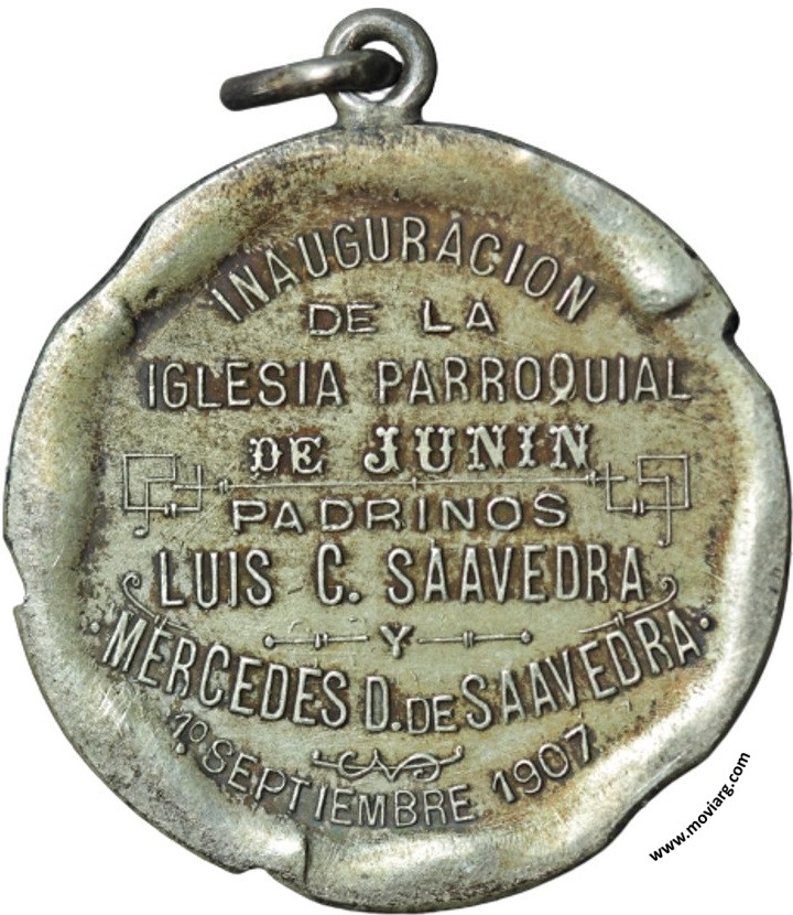 Anverso: SAN / IGNACIO / DE / LOYOLA. Firma: B. Y R. Campo: OMNIA / AD / (???) / DEI / GLORI- / AM Reverso: INAUGURACION / DE LA / IGLESIA PARROQUIAL / DE JUNIN / PADRINOS / LUIS C. SAAVEDRA / Y / MERCEDES D. DE SAAVEDRA / 1° SEPTIEMBRE 1907 Referencia: | |