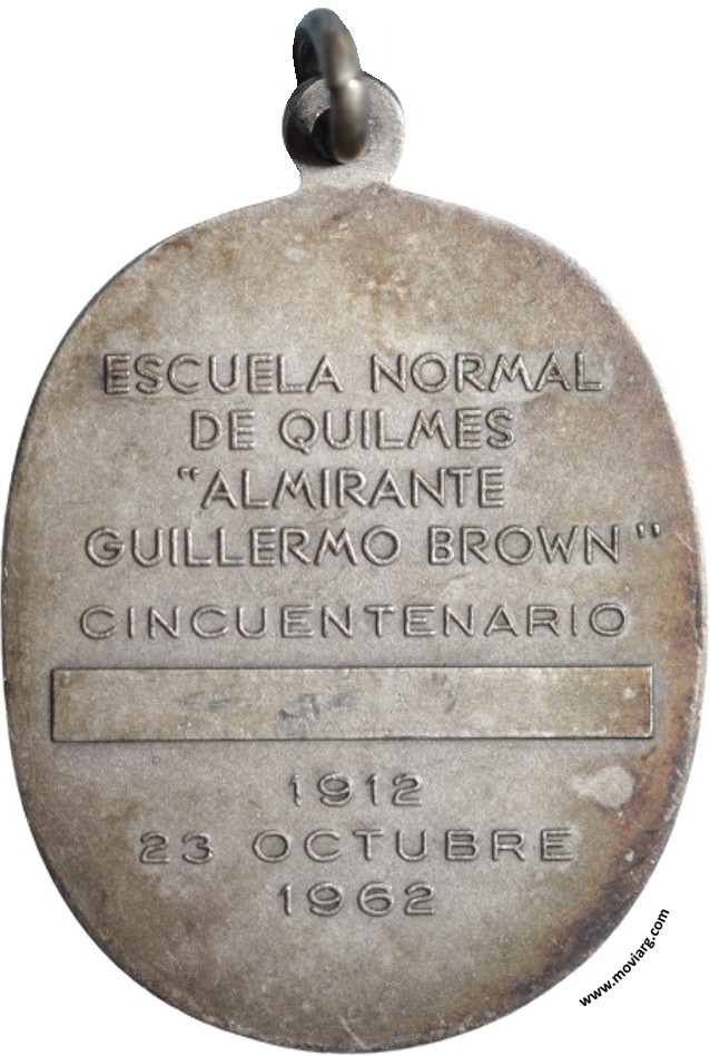 Colección @parryyanumismatico Anverso: GUILLERMO / BROWN. Firma: LUIS I. AQUINOReverso: ESCUELA NORMAL / DE QUILMES / " ALMIRANTE / GUILLERMO BROWN " / CINCUENTENARIO / 1912 / 23 OCTUBRE / 1962 Referencia: | |