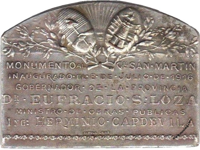 Anverso: CENTENARIO DE 1816 Reverso: MONUMENTO AL GAL. SAN MARTIN / INAUGURADO EL 8 DE JULIO DE 1916 / GOBERNADOR DE LA PROVINCIA / DR. EUFRACIO (sic) S. LOZA / MINISTRO DE OBRAS PUBLICAS / ING. HERMINIO CAPDEVILA. Firma: GIROLA GALLO Referencia: | |