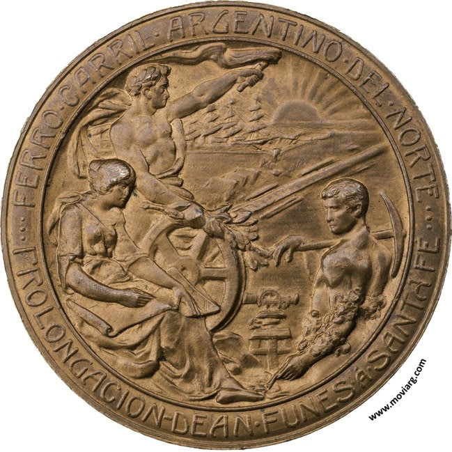 Anverso: FERRO · CARRIL · ARGENTINO · DEL · NORTE / PROLONGACION - DEAN · FUNES Á SANTA FÉ Reverso: INAUGURACION · DE · LOS · TRABAJOS / 16 · DE · OCTUBRE · DE · 1908 / PRESIDENTE DE LA REPÚBLICA / DOCTOR / JOSÉ · FIGUEROA · ALCORTA / MINISTRO DE OBRAS · PÚBLICAS / SEÑOR / EZEQUIEL · RAMOS · MEXIA. Firma: GOTTUZZO Y CA. Referencia: | |
