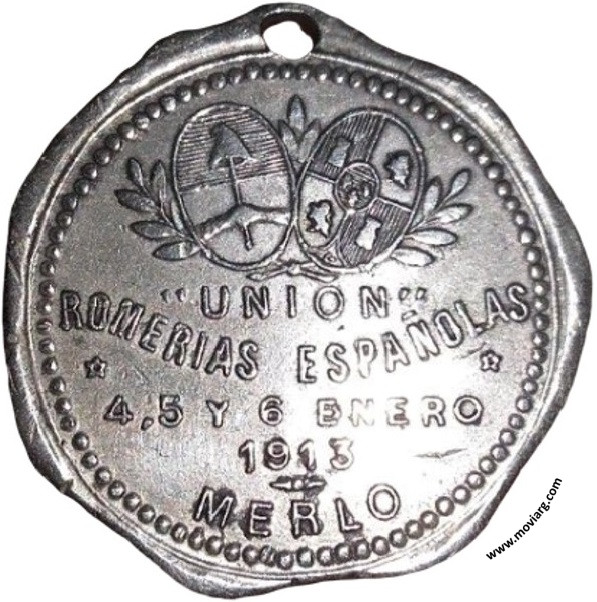 Anverso: Reverso: " UNION " / ROMERIAS ESPAÑOLAS / 4, 5 Y 6 ENERO / 1913 / MERLO Referencia: | |