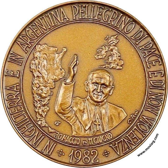 Anverso: IN INGHILTERRA E IN ARGENTINA PELLEGRINO DI PACE E DI NON VIOLENZA / 30 MAGGIO E 11 GIUGNO / 1982. Firma: C. POZZI Reverso: LA VITA DEL PAPA / IOANNES PAULUS II PONTIFEX Referencia: | |
