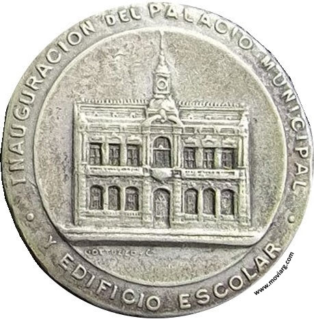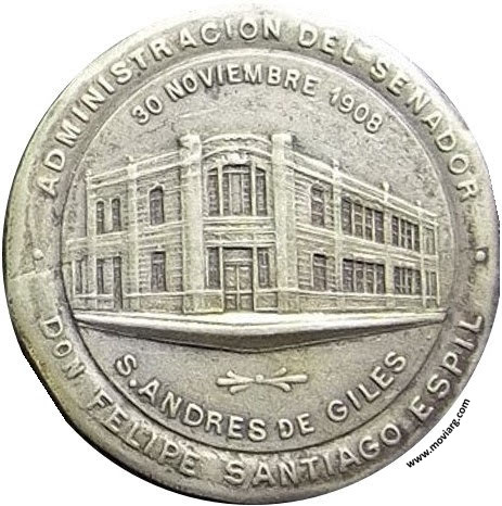 Anverso: INAUGURACION DEL PALACIO MUNICIPAL / Y EDIFICIO ESCOLAR. Firma: GOTTUZZO Y CA. Reverso: ADMINISTRACION DEL SENADOR / DON FELIPE SANTIAGO ESPIL / 30 NOVIEMBRE 1908 / S. ANDRES DE GILES Referencia: | |