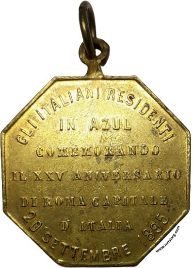 Anverso: Reverso: GLI ITALIANI RESIDENTI / IN AZUL / COMEMORANDO / IL XXV ANIVERSARIO / DI ROMA CAPITALE / D' ITALIA / 20 SETTEMBRE 1895 Referencia: | |