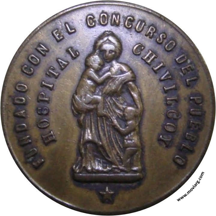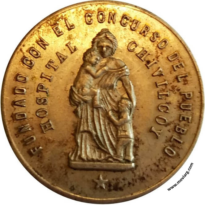 Anverso: FUNDADO CON EL CONCURSO DEL PUEBLO / HOSPITAL / CHIVILCOY Reverso: RECUERDO DE SU INAUGURACION / 25 / MAYO / 1887 Referencia: ROSA-/111 | |