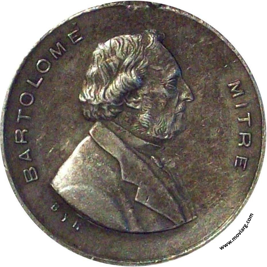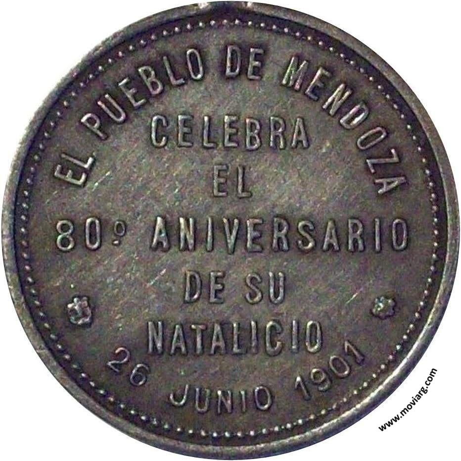 Anverso: BARTOLOME MITRE. Firma: B. Y R. Reverso: EL PUEBLO DE MENDOZA / CELEBRA / EL / 80° ANIVERSARIO / DE SU / NATALICIO / 26 JUNIO 1901 Referencia: ROSA-24 (M80) | |