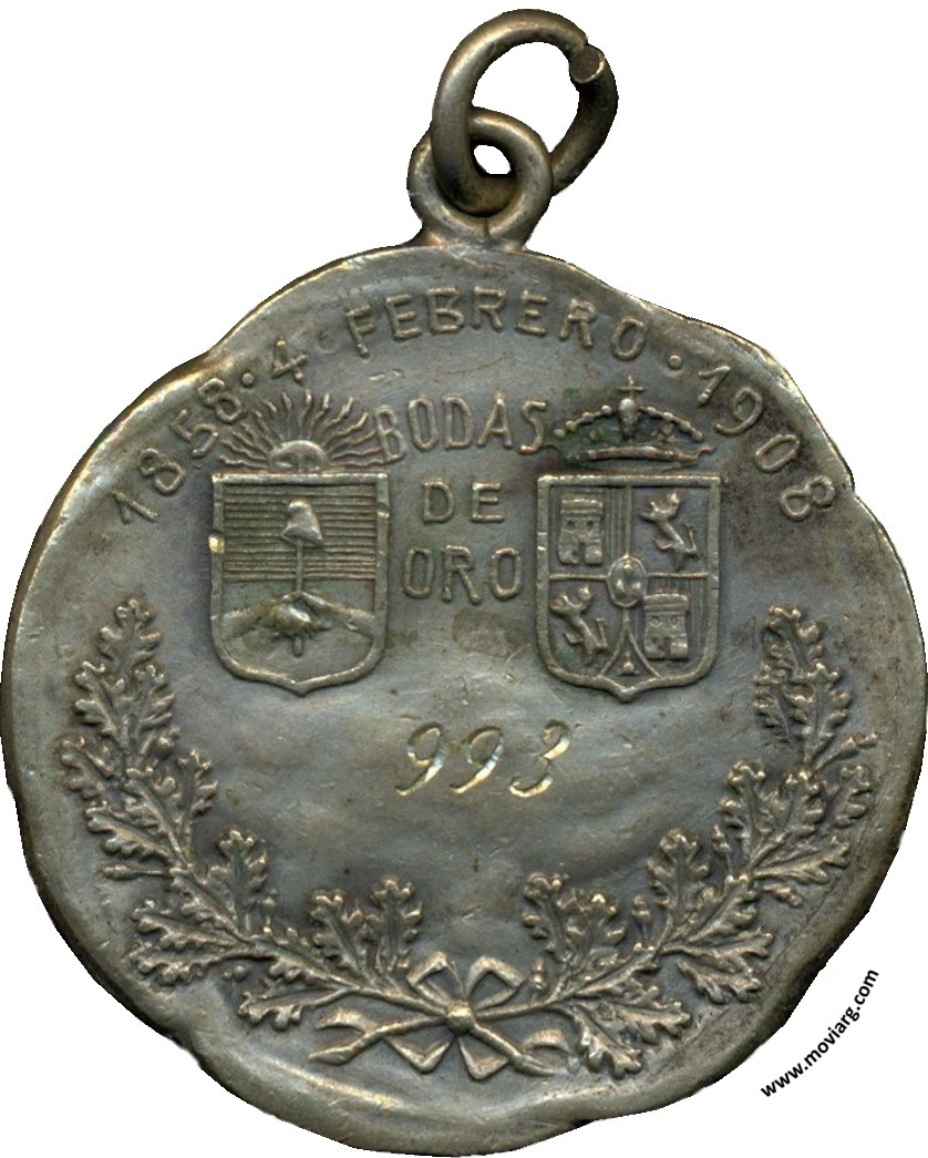 Anverso: SOCIEDAD / ESPAÑOLA / DE / SOCORROS MÚTUOS / DE / PERGAMINO. Firma: HORTA Y CIA. Reverso: 1858 - 4 FEBRERO - 1908 / BODAS / DE / ORO. Campo: [ 993 ] Referencia: | |