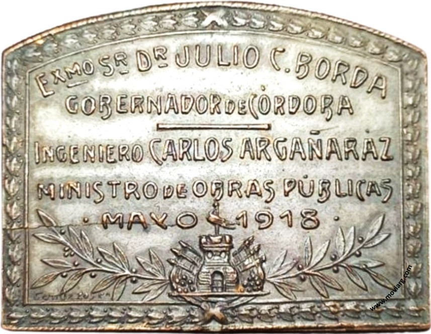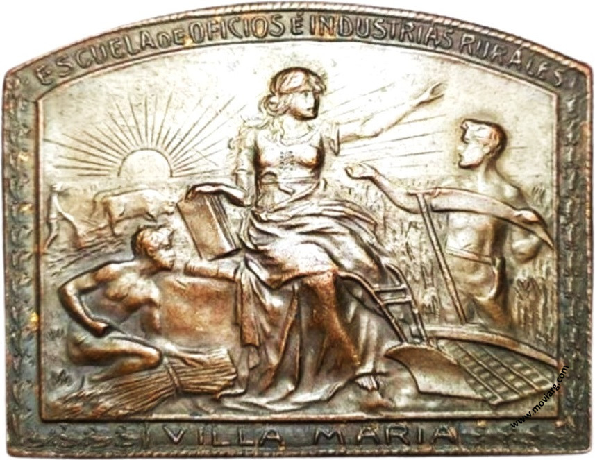 Anverso: ESCUELA DE OFICIOS É INDUSTRIAS RURALES / VILLA MARIA Reverso: EXMO. SR. DR. JULIO C.BORDA / GOBERNADOR DE CÓRDOBA / INGENIERO CARLOS ARGAÑARAZ / MINISTRO DE OBRAS PÚBLICAS / MAYO 1918. Firma: GOTTUZZO Y CA. Referencia: | |