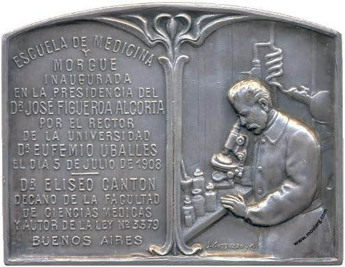 Colección CGDB Anverso:Reverso: ESCUELA DE MEDICINA / Y / MORGUE / INAUGURADA / EN LA PRESIDENCIA DEL / DR. JOSÉ FIGUEROA ALCORTA / POR EL RECTOR / DE LA UNIVERSIDAD / DR. EUGEMIO UBALLES / EL DIA 5 DE JULIO DE 1908 / DR. ELISEO CANTON / DECANO DE LA FACULTAD / DE CIENCIAS MÉDICAS / Y AUTOR DE LA LEY N° 3379 / BUENOS AIRES. Firma: J. GOTTUZZO Y CA. Referencia: | |