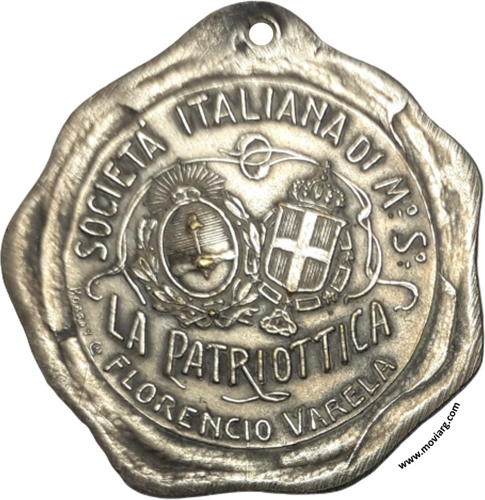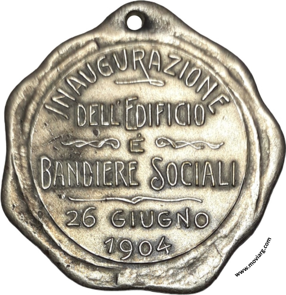 Anverso: SOCIETÁ ITALIANA DI M.S. / LA PATRIOTICA / FLORENCIO VARELA. Firma: HORTA Y CIA. Reverso: INAUGURACIONE / DELL' EDIFICIO / É / BANDIERE SOCIALI / 26 GIUGNO / 1904 Referencia: | |