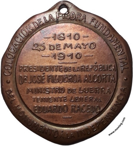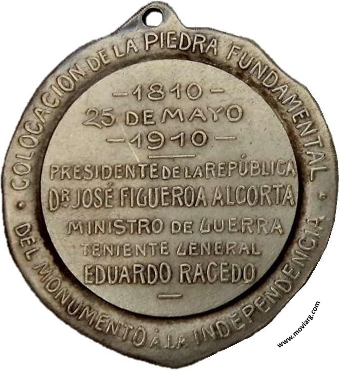 Anverso: CORNELIO SAAVEDRA / 1761 / 1829 Reverso: COLOCACION DE LA PIEDRA FUNDAMENTAL / DEL MONUMENTO Á LA INDEPENDENCIA / - 1810 - / 25 DE MAYO / - 1910 - / PRESIDENTE DE LA REPÚBLICA / DR. JOSÉ FIGUEROA ALCORTA / MINISTRO DE GUERRA / TENIENTE GENERAL / EDUARDO RACEDO Referencia: | |