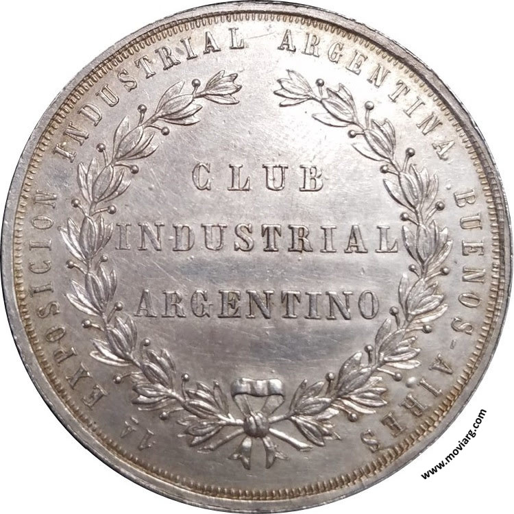 Anverso: REPÚBLICA ARGENTINA / 1876. Firma: F. Z. Reverso: 1A. EXPOSICION INDUSTRIAL ARGENTINA BUENOS AIRES / CLUB / INDUSTRIAL / ARGENTINO Canto: Humberto Burzio: "Buenos Aires en la medalla" 1981 p437. Referencia: BURZIO-1255 ROSA-/185 | |