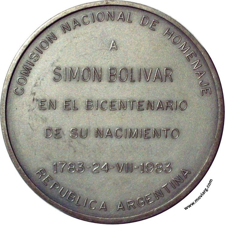 Anverso: SIMON BOLIVAR. Firma: J. FIORAVANTI Reverso: COMISION NACIONAL DE HOMENAJE / A / SIMON BOLIVAR / EN EL BICENTENARIO / DE SU NACIMIENTO / 1783 - 24 - VII - 1983 / REPUBLICA ARGENTINA Referencia: | |