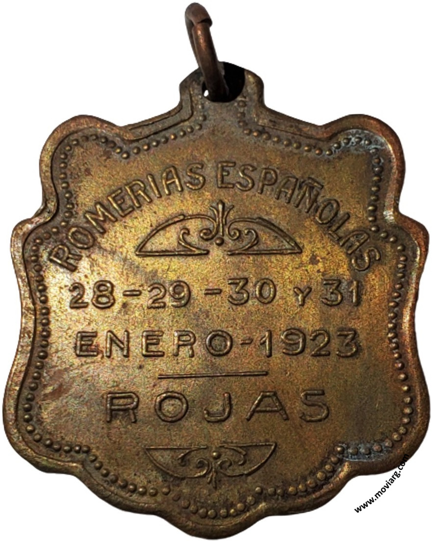 | Año: 1923 Romerías Metal: Cobre - Peso: 10.52gr - Módulo: 30.31x34.94mm - Espesor: 1.72mm - Rotación: 12hrs Grabador: Horta (?) | |