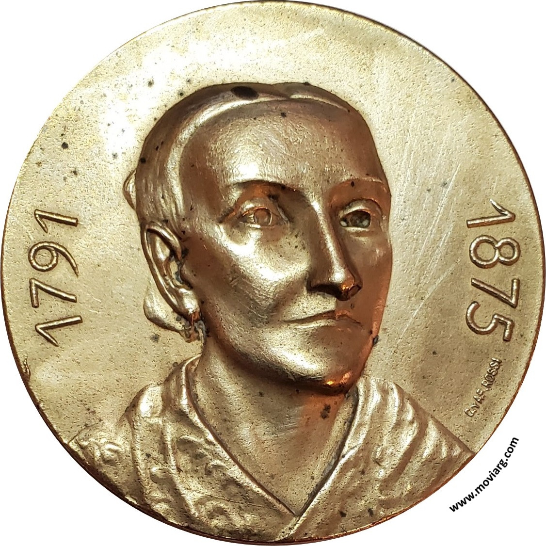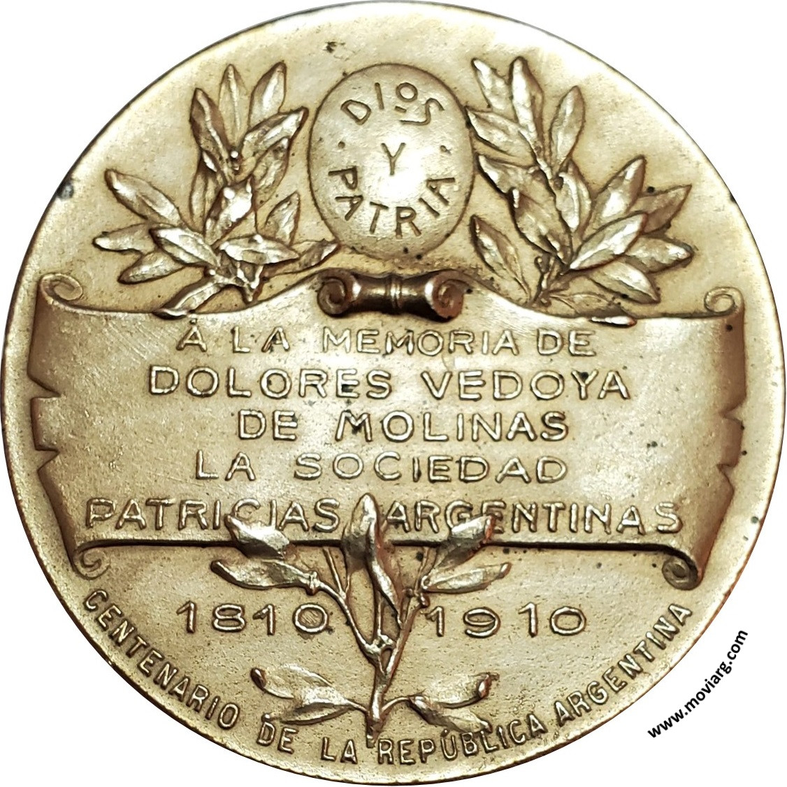 Anverso: 1791 / 1875. Firma: C. Y AF. ROSSI Reverso: DIOS / Y / PATRIA / Á LA MEMORIA DE / DOLORES VEDOYA / DE MOLINAS / LA SOCIEDAD / PATRICIAS ARGENTINAS / 1810 1910 / CENTENARIO DE LA REPÚBLICA ARGENTINA Referencia: | |