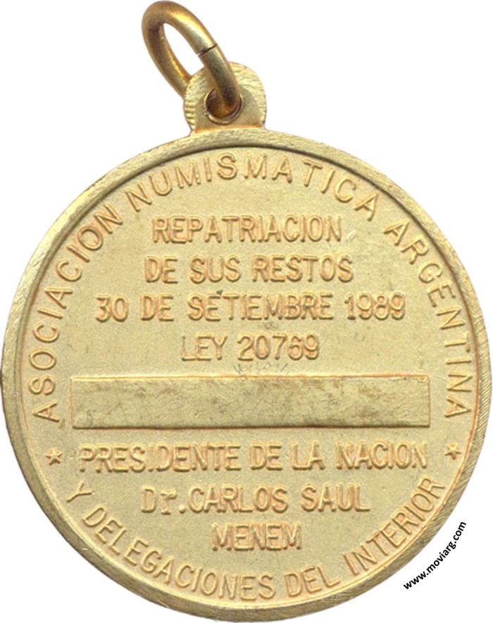 Anverso: BRIGADIER GENERAL D. JUAN MANUEL DE ROSAS. Firma: A.N.A. Reverso: ASOCIACION NUMISMATICA ARGENTINA / Y DELEGACIONES DEL INTERIOR / REPATRIACION / DE SUS RESTOS / 30 DE SETIEMBRE 1989 / LEY 20769 / PRESIDENTE DE LA NACION / DR. CARLOS SAUL / MENEM Referencia: | |