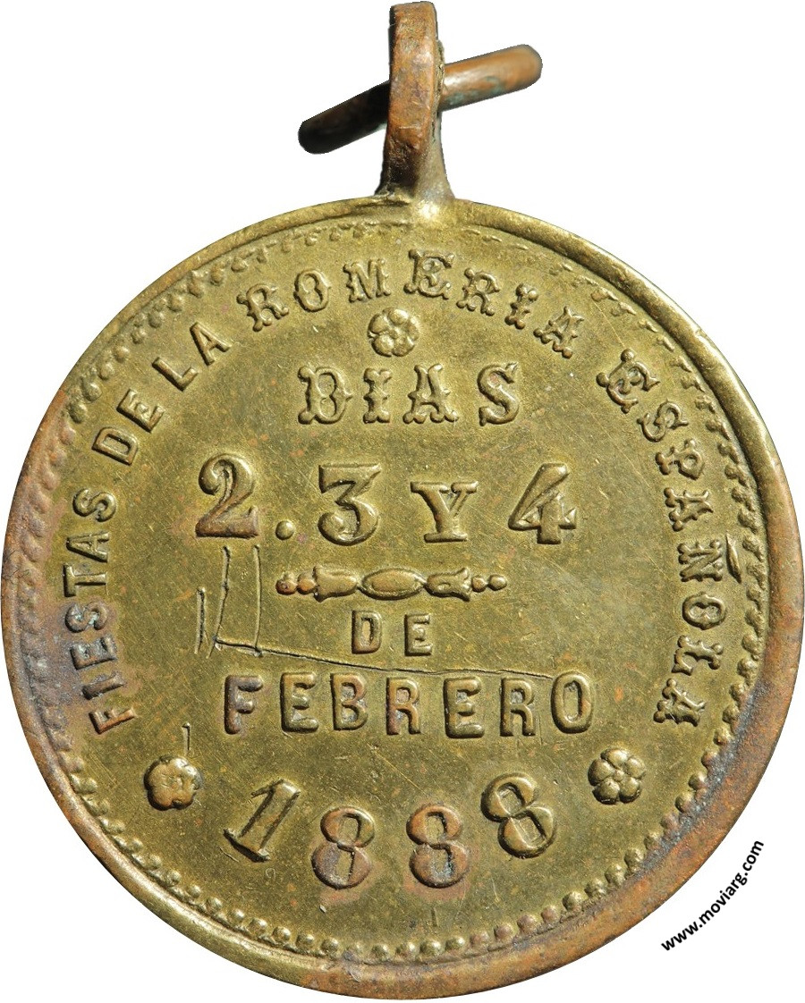 Anverso: ASOCIACION ESPAÑOLA DE SOCORROS MUTUOS / MERCEDES. Firma: P. SIRI Reverso: FIESTAS DE LA ROMERIA ESPAÑOLA / DIAS / 2, 3 Y 4 / DE / FEBRERO / 1888. Firma: (I) Referencia: | |
