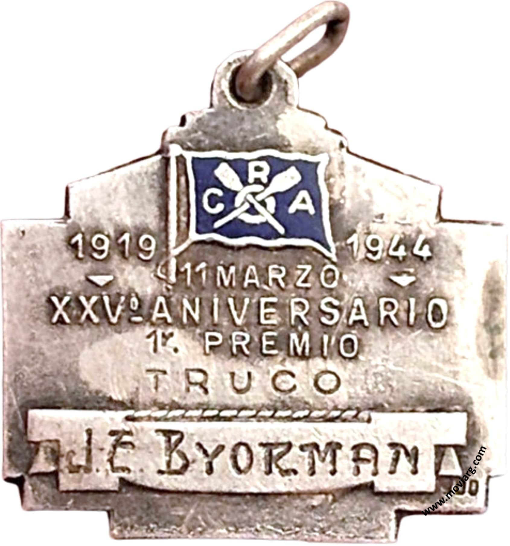 Anverso: CLUB REMEROS ALBERDI. Firma: O. GALLO Reverso: 1919 / 11 MARZO / 1944 / XXV° ANIVERSARIO / [ 1R. ] PREMIO / [ TRUCO ] / [ J. E. BYORMAN ]. Exergo: [ 900 ]. Campo: C. / R. / A. Referencia: | |