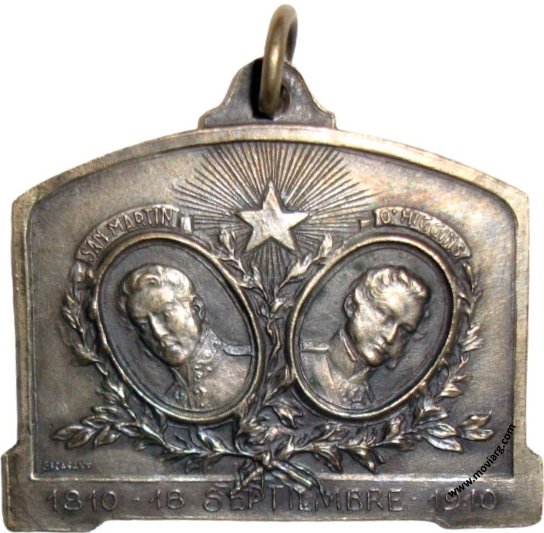 Anverso: 1810 - 18 SEPTIEMBRE - 1910. Campo: SAN MARTIN / O'HIGGINS. Firma: ESCASANY Reverso: LA ESCUELA MILITAR DE CHILE / Á SUS COMPAÑEROS DEL / COLEGIO MILITAR ARGENTINO Referencia: | |