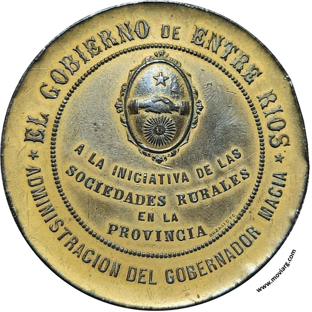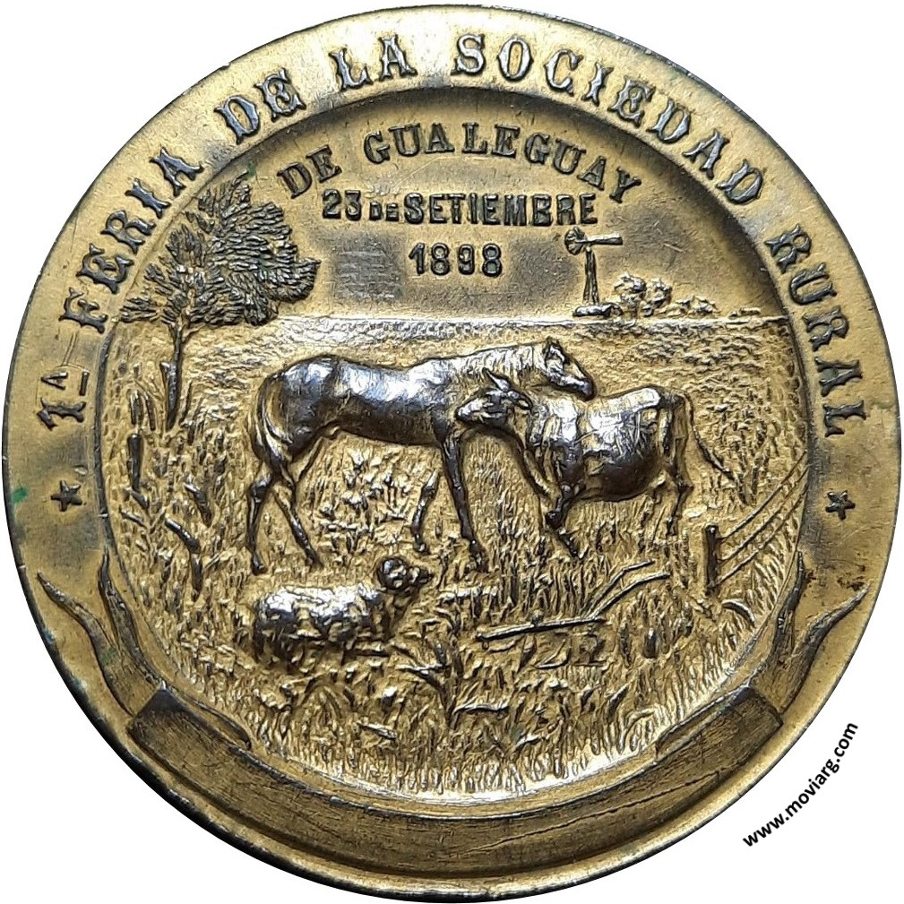 Anverso: 1A. FERIA DE LA SOCIEDAD RURAL / DE GUALEGUAY / 23 DE SETIEMBRE / 1898 Reverso: EL GOBIERNO DE ENTRE RIOS / ADMINISTRACION DEL GOBERNADOR MACIA / A LA INICIATIVA DE LAS / SOCIEDADES RURALES / EN LA / PROVINCIA. Firma: ORZALI B. Y C. Referencia: | |