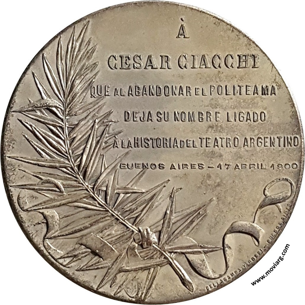 Anverso: CESAR / CIACCHI. Firma: C. MASSA ESC. Reverso: A / CESAR CIACCHI / QUE AL ABANDONAR EL POLITEAMA / DEJA SU NOMBRE LIGADO / A LA HISTORIA DEL TEATRO ARGENTINO / BUENOS AIRES - 17 ABRIL 1900. Firma: BELLAGAMBA Y ROSSI - BUENOS AIRES Referencia: | |