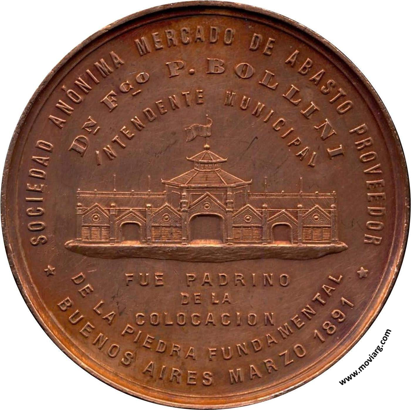 Anverso: SOCIEDAD ANÓNIMA MERCADO DE ABASTO PROVEEDOR / DN. FCO. P. BOLLINI / INTENDENTE MUNICIPAL / FUE PADRINO / DE LA / COLOCACION / DE LA PIEDRA FUNDAMENTAL / BUENOS AIRES MARZO 1891 Reverso: DIRECTORIO / PTE. - SGO. ROLLERI / VICE PTE. - VTE. PELUFFO / TRO. - EO. DEVOTO / VOCALES / SGO. DEVINCENZI / ATIN. BADARACO / FTO. CAPURRO / SRIO. MIGUEL CAMUYRANO Referencia: BURZIO-3439 | |