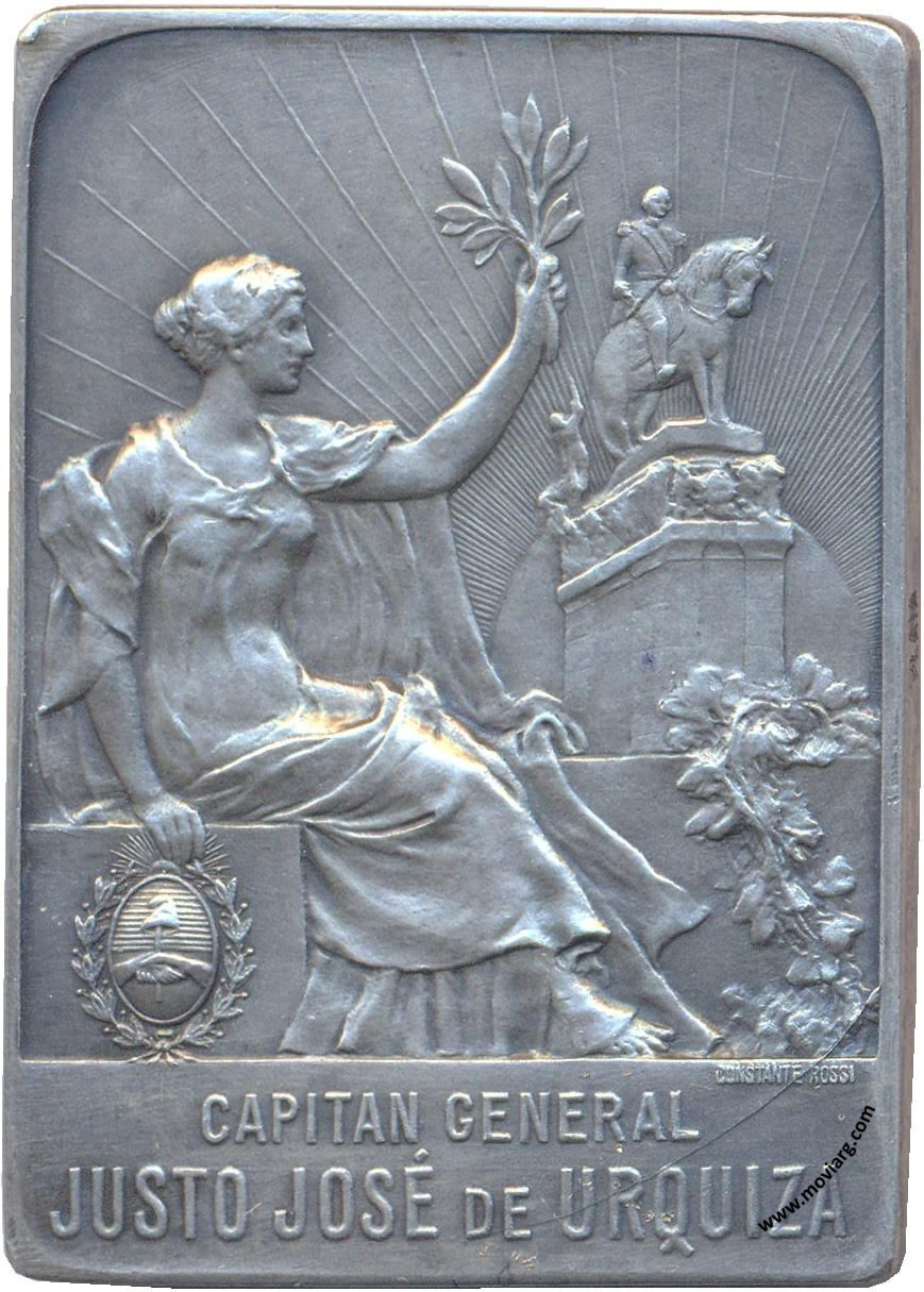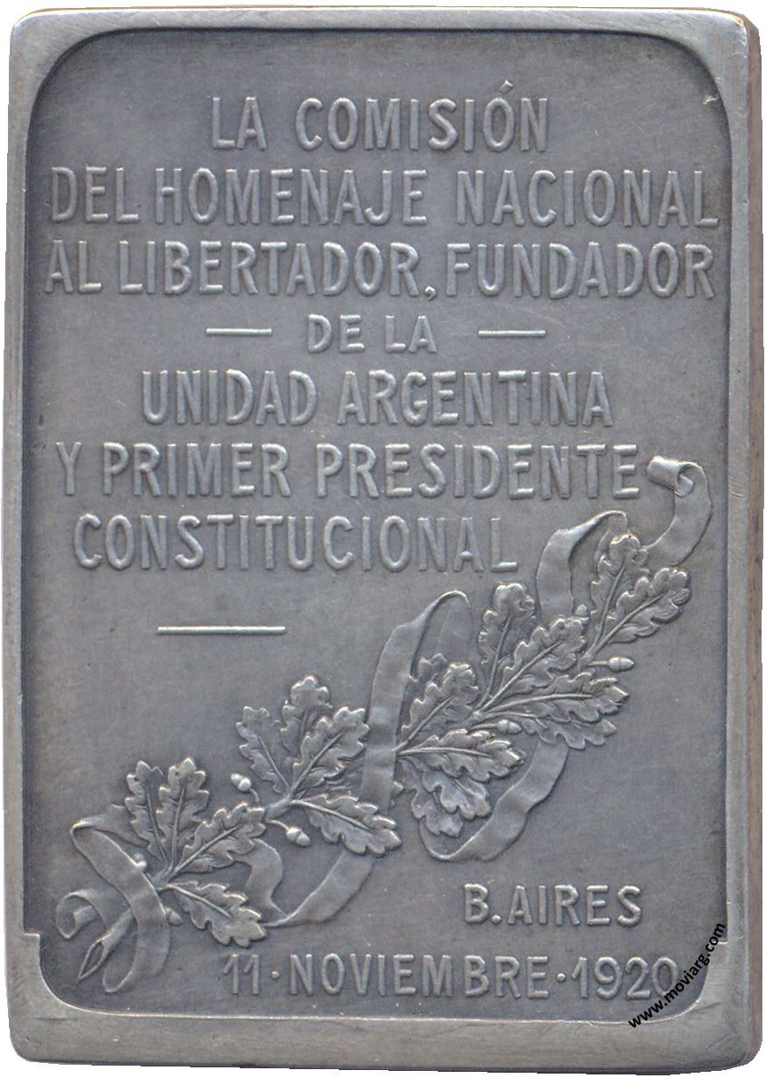 Anverso: CAPITAN GENERAL / JUSTO JOSÉ DE URQUIZA. Firma: CONSTANTE ROSSI Reverso: LA COMISIÓN / DEL HOMENAJE NACIONAL / AL LIBERTADOR, FUNDADOR / DE LA / UNIDAD ARGENTINA / Y PRIMER PRESIDENTE / CONSTITUCIONAL / B. AIRES / 11 NOVIEMBRE 1920 Canto: Liso. PLATA Referencia: | |