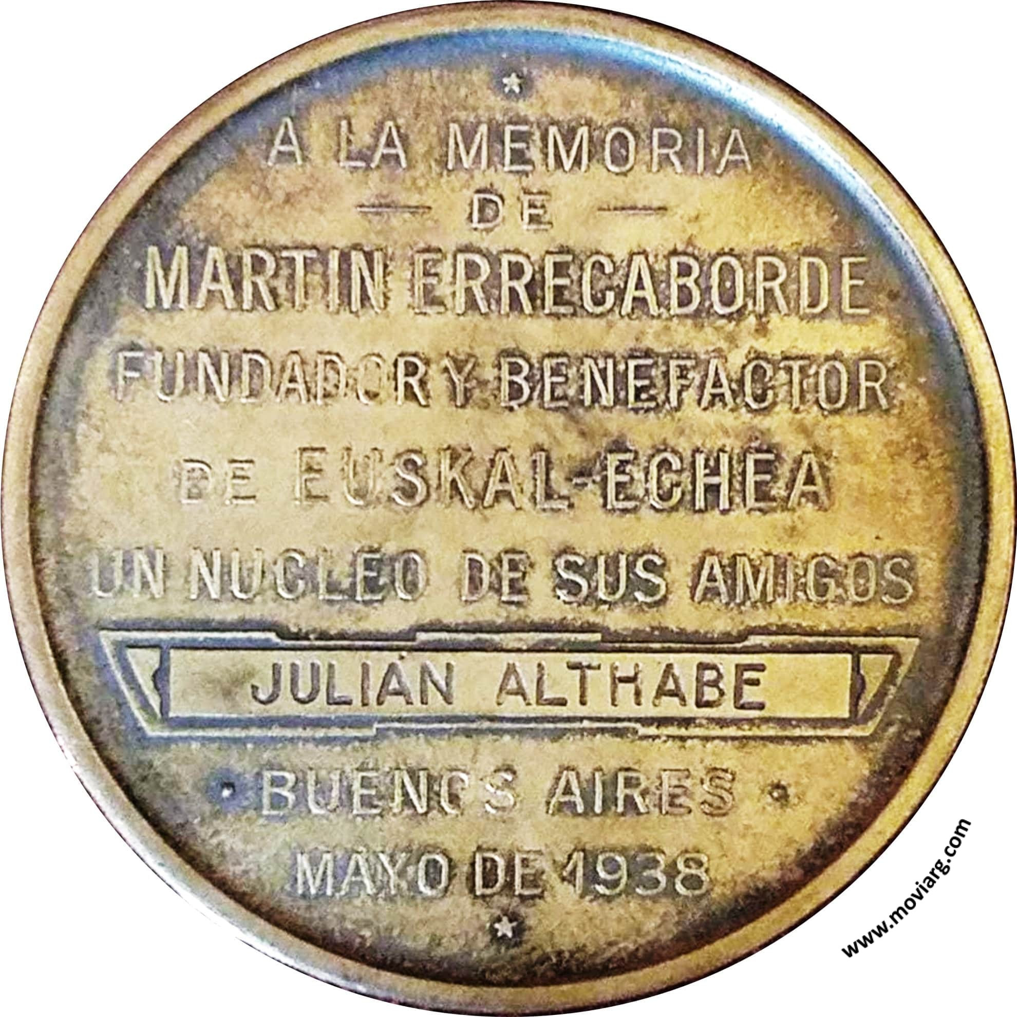 Anverso: Firma: CONSTANTE ROSSI Reverso: A LA MEMORIA / DE / MARTIN ERRECABORDE / FUNDADOR Y BENEFACTOR / DE EUSKAL-ECHEA / UN NUCLEO DE SUS AMIGOS / [ JULIÁN ATHALBE ] / BUENOS AIRES / MAYO DE 1938 Referencia: | |