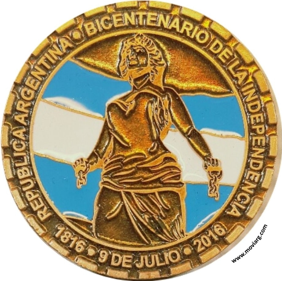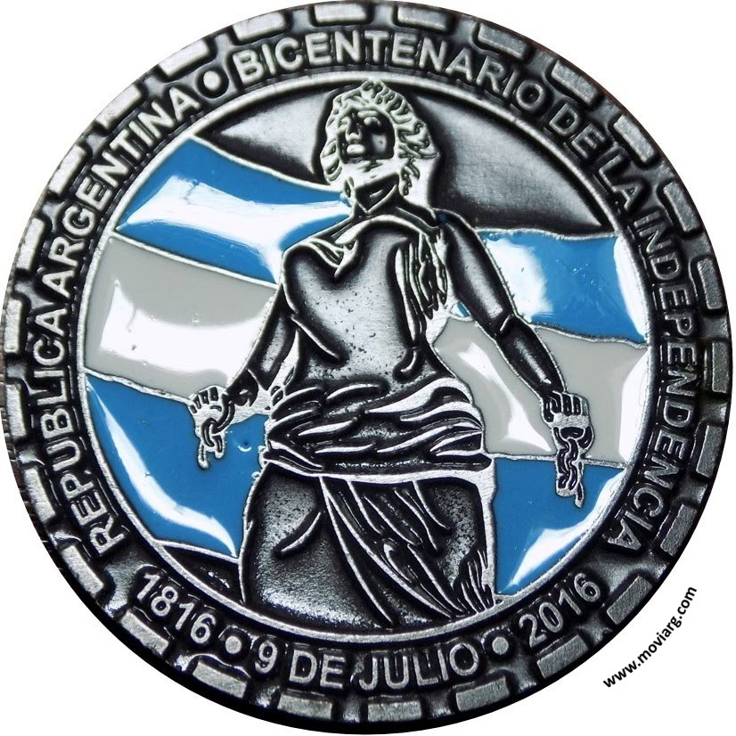 Colección Nicolás Pittavino Anverso: REPUBLICA ARGENTINA · BICENTENARIO DE LA INDEPENDENCIA / 1816 · 9 DE JULIO · 2016. Descripción: En el campo, y dentro de una gráfila interna lineal, reproducción parcial de la estatua de la Libertad, obra de la artista tucumana Lola Mora, que consiste en una mujer con vestimentas clásicas y tocada por un gorro de la libertad que sostiene en sus manos restos de una cadena rota, sobre un fondo esmaltado con los colores de la Bandera Nacional. Alrededor, fuera de la gráfila interna, leyenda / REPUBLICA ARGENTINA · BICENTENARIO DE LA INDEPENDENCIA / en arco superior, y / 1813 · 9 DE JULIO · 2016 /, en arco inferior. Reborde de guiones gruesos.Reverso: CENTRO NUMISMATICO DE TUCUMAN / XXXVI / 13 - 14 AGO / JORNADAS NACIONALES DE / NUMISMATICA Y MEDALLISTICA. Descripción: En el centro, isologotipo del Centro Numismático de Tucumán, que consiste en un sol de treinta y dos rayos ondeados horarios en cuyo centro se aprecia el reverso de una peseta tucumana, con el óvalo y las iniciales / TN / visibles. En arco superior, leyenda / CENTRO NUMISMÁTICO DE TUCUMÁN /, y en arco inferior, leyenda en dos partes y dos líneas / XXXVI / 13 - 14 AGO / y / JORNADAS NACIONALES DE / NUMISMATICA Y MEDALLISTICA/ Referencia: | |