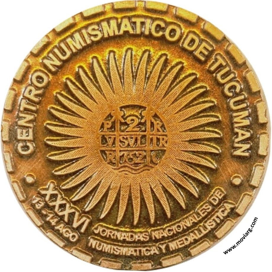 Anverso: REPUBLICA ARGENTINA · BICENTENARIO DE LA INDEPENDENCIA / 1816 · 9 DE JULIO · 2016. Descripción: En el campo, y dentro de una gráfila interna lineal, reproducción parcial de la estatua de la Libertad, obra de la artista tucumana Lola Mora, que consiste en una mujer con vestimentas clásicas y tocada por un gorro de la libertad que sostiene en sus manos restos de una cadena rota, sobre un fondo esmaltado con los colores de la Bandera Nacional. Alrededor, fuera de la gráfila interna, leyenda / REPUBLICA ARGENTINA · BICENTENARIO DE LA INDEPENDENCIA / en arco superior, y / 1813 · 9 DE JULIO · 2016 /, en arco inferior. Reborde de guiones gruesos. Reverso: CENTRO NUMISMATICO DE TUCUMAN / XXXVI / 13 - 14 AGO / JORNADAS NACIONALES DE / NUMISMATICA Y MEDALLISTICA. Descripción: En el centro, isologotipo del Centro Numismático de Tucumán, que consiste en un sol de treinta y dos rayos ondeados horarios en cuyo centro se aprecia el reverso de una peseta tucumana, con el óvalo y las iniciales / TN / visibles. En arco superior, leyenda / CENTRO NUMISMÁTICO DE TUCUMÁN /, y en arco inferior, leyenda en dos partes y dos líneas / XXXVI / 13 - 14 AGO / y / JORNADAS NACIONALES DE / NUMISMATICA Y MEDALLISTICA/ Referencia: | |