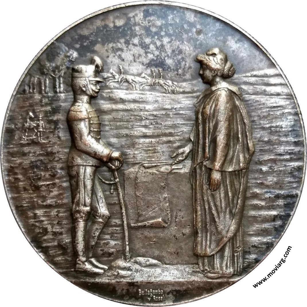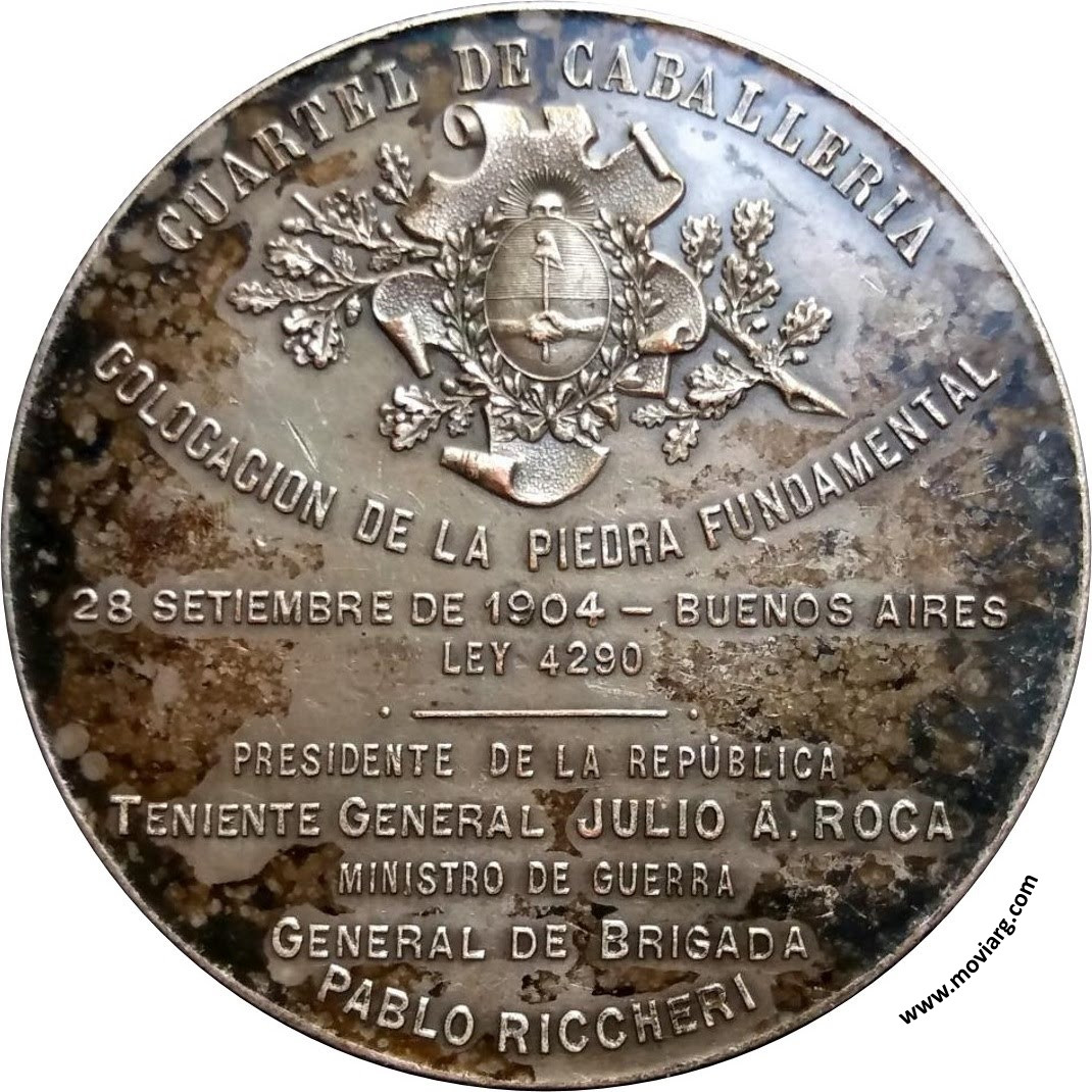 Anverso: Firma: BELLAGAMBA / Y ROSSI Reverso: CUARTEL DE CABALLERIA / COLOCACION DE LA PIEDRA FUNDAMENTAL / 28 SETIEMBRE DE 1904 - BUENOS AIRES / LEY 4290 / PRESIDENTE DE LA REPÚBLICA / TENIENTE GENERAL JULIO A. ROCA / MINISTRO DE GUERRA / GENERAL DE BRIGADA / PABLO RICCHERI Referencia: | |