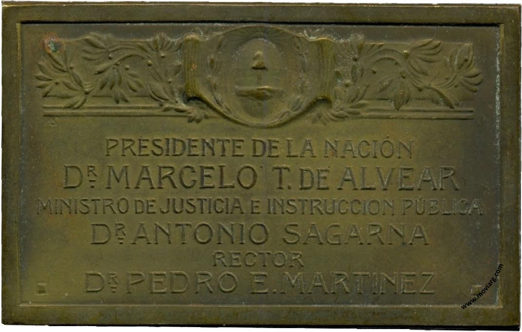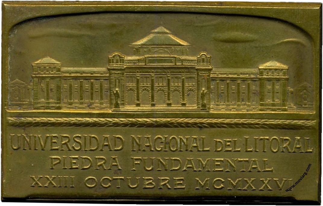 Anverso: UNIVERSIDAD NACIONAL DEL LITORAL / PIEDRA FUNDAMENTAL / XXIII OCTUBRE MCMXXVI Reverso: PRESIDENTE DE LA NACIÓN / DR. MARCELO T. DE ALVEAR / MINISTRO DE JUSTICIA E INSTRUCCION PÚBLICA / DR. ANTONIO SAGARNA / RECTOR / DR. PEDRO E. MARTINEZ Referencia: | |
