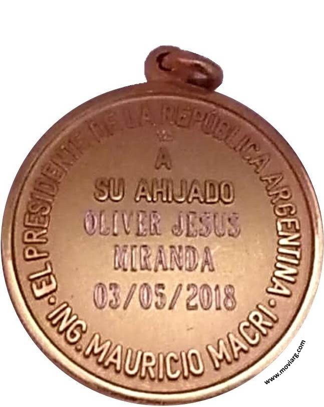 Anverso: PRESIDENCIA DE LA REPÚBLICA ARGENTINA Reverso: EL PRESIDENTE DE LA REPÚBLICA ARGENTINA / ING. MAURICIO MACRI / A / SU AHIJADO / [ OLIVER JESUS ] / [ MIRANDA ] / [ 03/05/2018 ] Referencia: | |