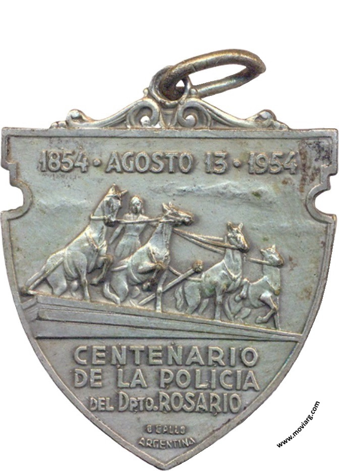 Anverso: 1854 · AGOSTO 13 · 1954 / CENTENARIO / DE LA POLICIA / DEL DPTO. ROSARIO. Firma: O. GALLO / ARGENTINA Reverso: JEFATURA DE POLICIA DEL DTO. ROSARIO / SANTA FE Referencia: | |