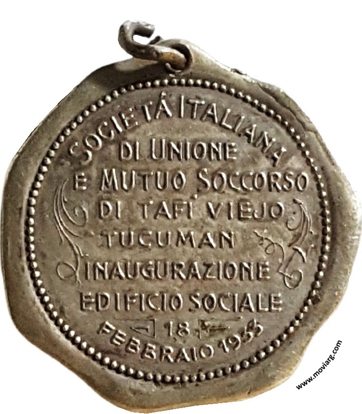 Anverso: Firma: S.P.Q.R. Reverso: SOCIETÁ ITALIANA / DI UNIONE / E MUTUO SOCCORSO / DI TAFÍ VIEJO / TUCUMAN / INAUGURAZIONE / EDIFICIO SOCIALE / 18 / FEBBRAIO 1933 Referencia: | |